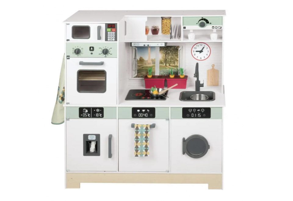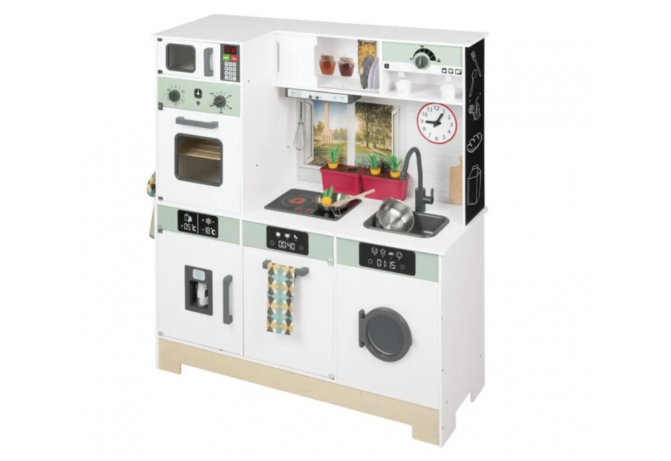 - Багатий набір аксесуарів: сковорідка та каструля з сумісними кришками, виделка та лопатка, віничок, кухарська шапка, фартух, рушник, кухонна рукавиці, кошик для миття з 2 чашками та 2 тарілками, 2 пластикові горщики та решітка для сушіння посуду.