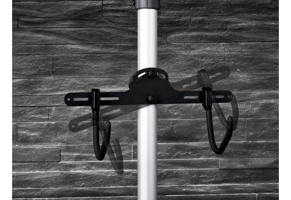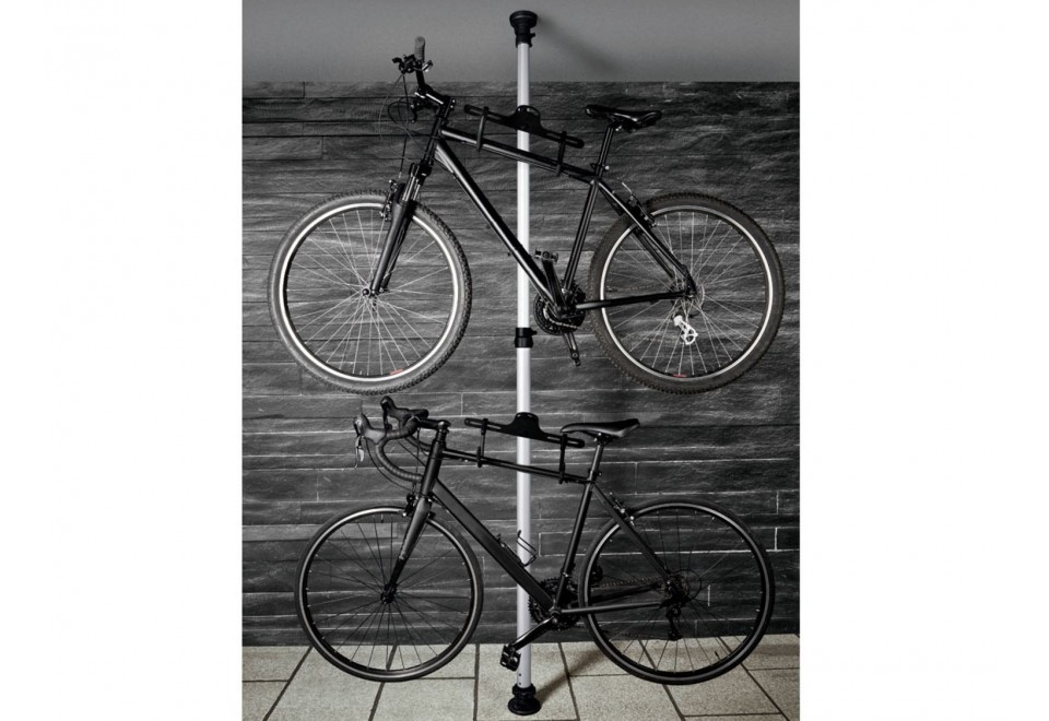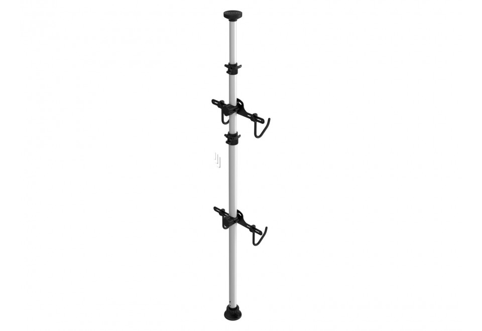 Телескопічна стійка для велосипедів призначена для зберігання 2 велосипедів. Даний варіант є дуже практичним рішенням, що дозволяє заощадити простір у вашому приміщені. Телескопічна штанга має дві вішалки, які регулюються по висоті та ширині. Гачки для підвішування велосипедів виготовлені з пластику, який захищає велосипед від подряпин. Стелаж призначений для приміщень висотою не менше 2 м. Швидкий і простий монтаж є великою перевагою. Максимальне навантаження на один гачок: 30 кг.